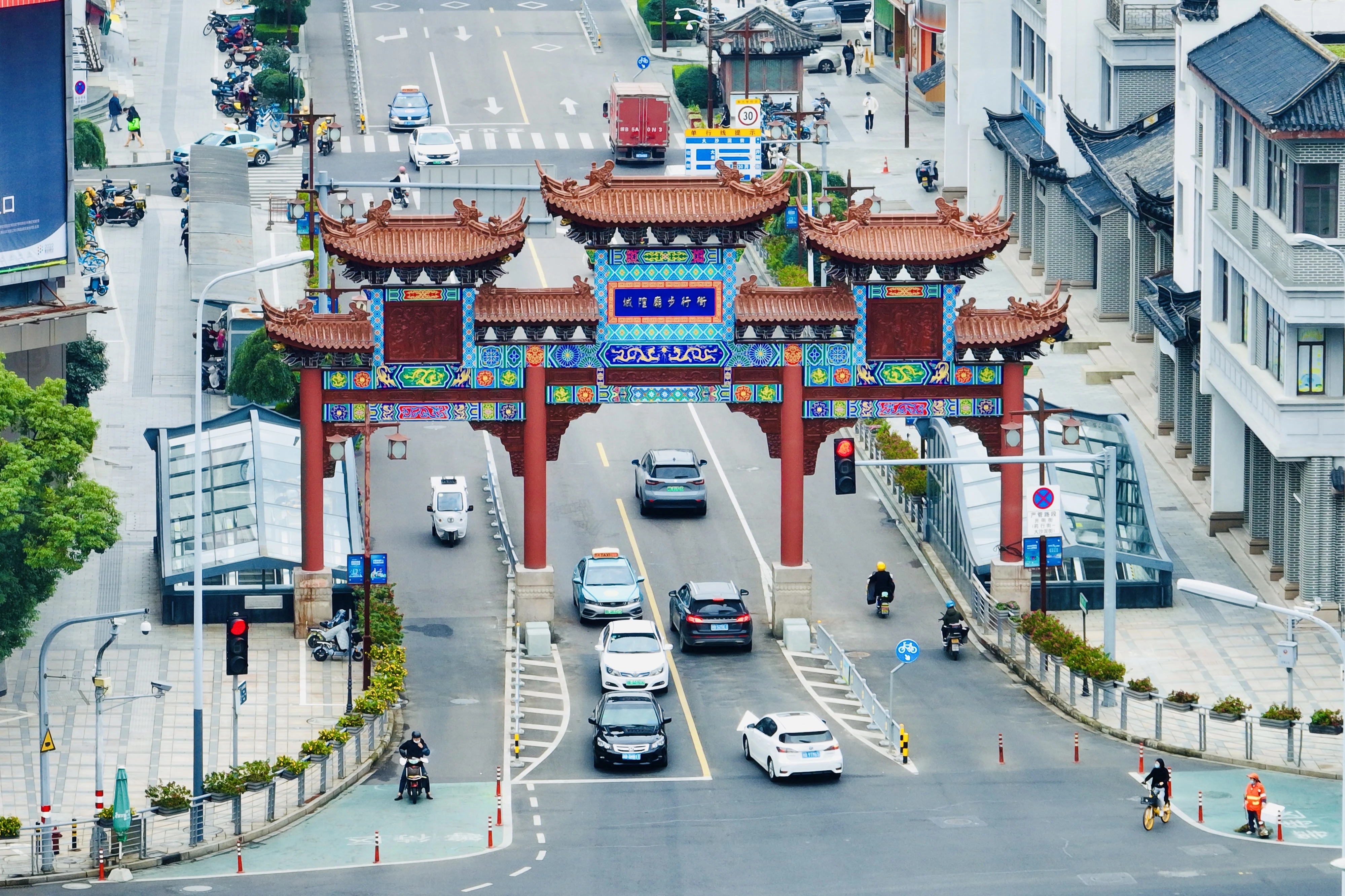修繕后的城隍廟牌坊浮雕精工細(xì)琢,斗拱層疊,檐角飛翹,彩繪圖案色彩亮麗、刻畫精美,四根朱紅色的立柱明亮可鑒、氣勢恢弘,匾額上的“國泰民安”四個(gè)字寄托了對(duì)這座城市的美好祝愿。